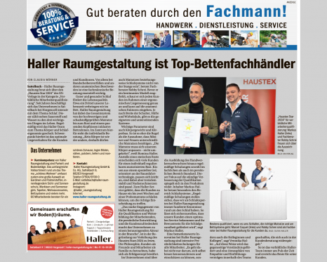 „Haller Raumgestaltung freut sich über den „Haustex Star 2024“ des SN- Verlags in der Kategorie „Vorbildliche Mitarbeiterqualifizierung“. Seit Jahren beschäftigt sich das Unternehmen in Sattelbach bei Horgenzell intensiv mit dem Thema Schlaf. Dieser zählt neben Sauerstoff und Wasser zu den drei wichtigsten Dingen im Leben. Regelmäßig wird das Haller-Team zum Thema Körper und Schlafergonomie geschult. Schwerpunkt hierbei ist das optimale Liegeverhalten für die Kunden und Kundinnen. Vor allem bei Bandscheibenvorfällen und an- deren anatomischen Beschwerden ist eine fachmännische Beratung essentiell wichtig.“