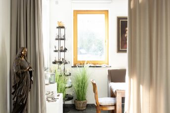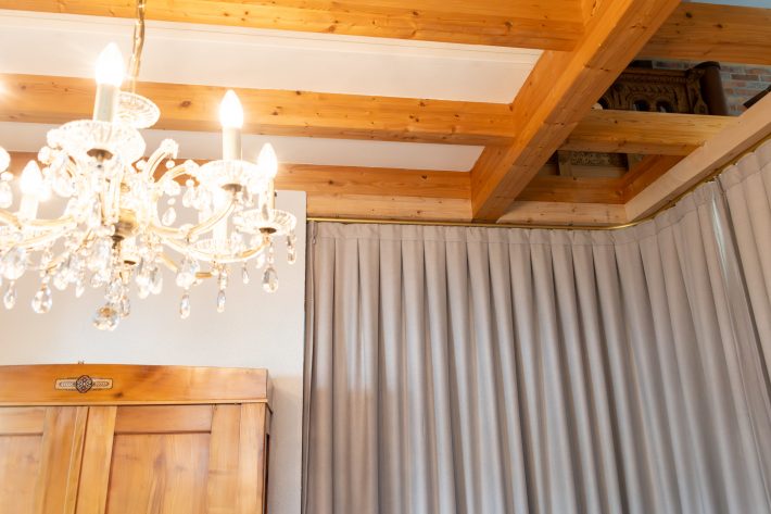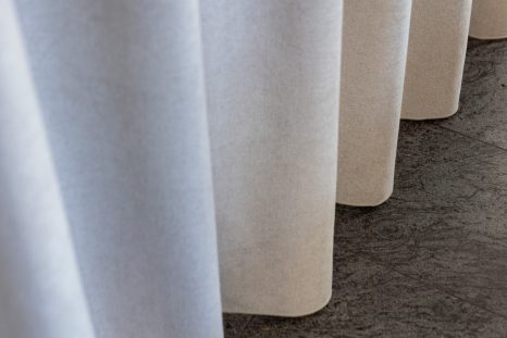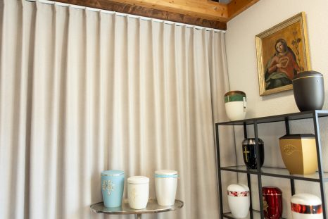 Durch das Anbringen von maßgefertigten, gebogenen Deckenschienen in weiß und gold sowie blickdichten Thermo- und Akustikgardinen lässt sich im Handumdrehen der Raum in zwei separate Besprechungsräume abtrennen. Die hochwertigen Chenille-Stoffe bestehen aus 100 % recyceltem Polyester und bieten auf beiden Seiten eine angenehme Haptik. Neben stilvoller Optik sorgen sie für Wärme, Schallschutz und Wohlfühlen. Eine flexible Lösung optimal für Besprechungen eines würdevollen Abschieds der Liebsten.