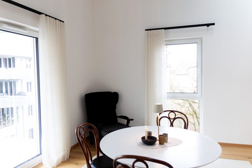 Für dieses Projekt durfte unser Team nicht nur eine edle Landhausdiele verlegen, sondern auch noch die Fenster mit fließenden Gardinen bestücken. Dafür wurden Stoffe und Stangen ausgewählt, die Fenster vermessen, die Gardinen genäht, Stangen montiert, Stoffe angefügt und dann natürlich in der Anwendung getestet. Die schlichten Gardinenstangen setzen klare Akzente während der Stoff sich ins Gesamtbild einfügt. So dient der Stoff nicht nur für Sichtschutz sondern verleiht auch Wohnlichkeit.