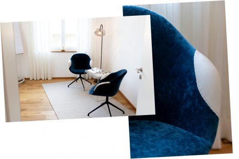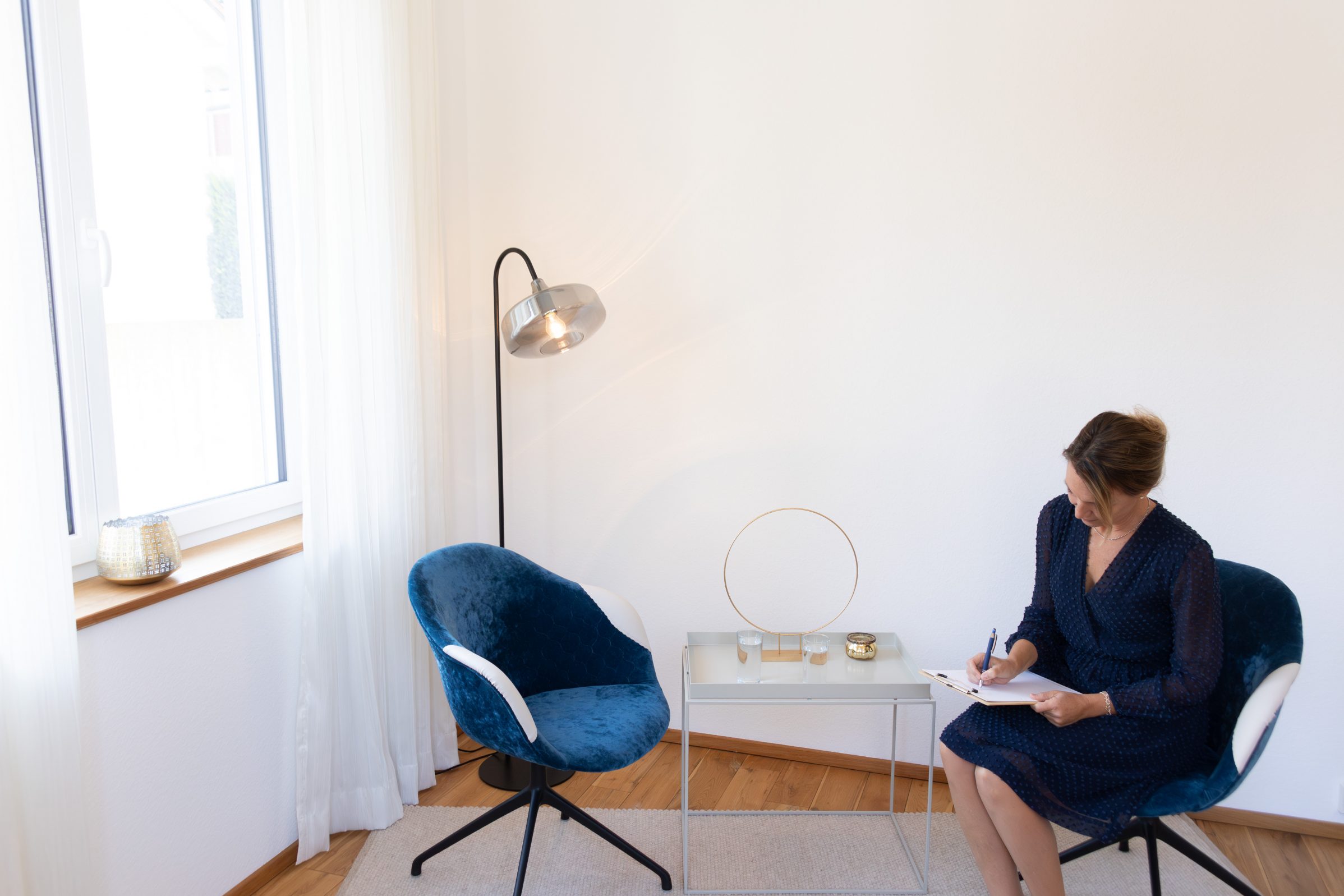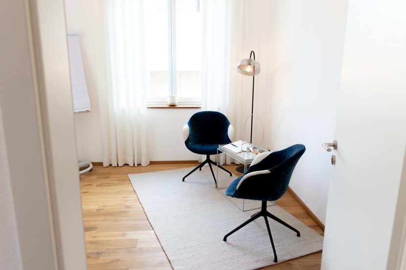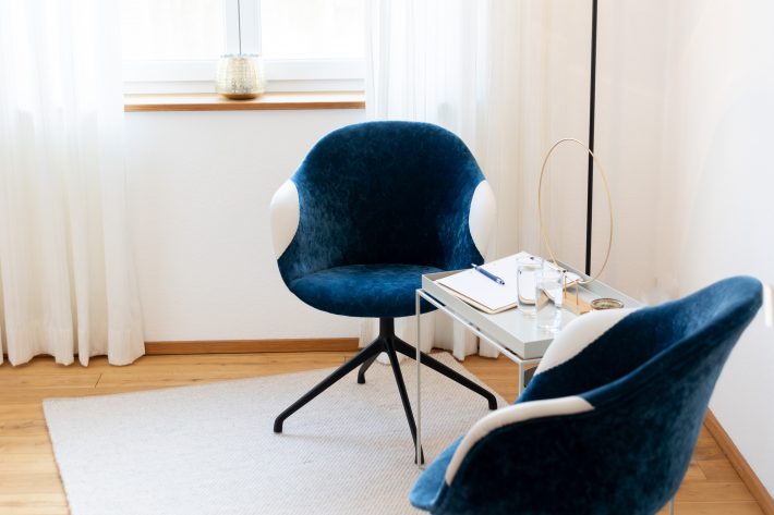 Für die Neugestaltung eines Coachingraums haben wir gemeinsam mit unserer Kundin ein stimmiges Gesamtkonzept entwickelt. Die bestehenden, hochwertigen Stühle wurden neu aufgepolstert und mit einem kontrastierenden Leder versehen, das ihre elegante Form unterstreicht. Ergänzt wurde das neue Raumgefühl durch einen erdigen Teppich, maßgefertigte Gardinen und charaktervolle Lampen, die den Look harmonisch abrunden.